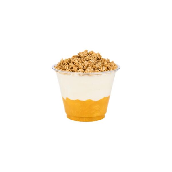 Mangue, protéine à la vanille, yogourt grec, flocons de noix de coco, granola, sirop de vanille